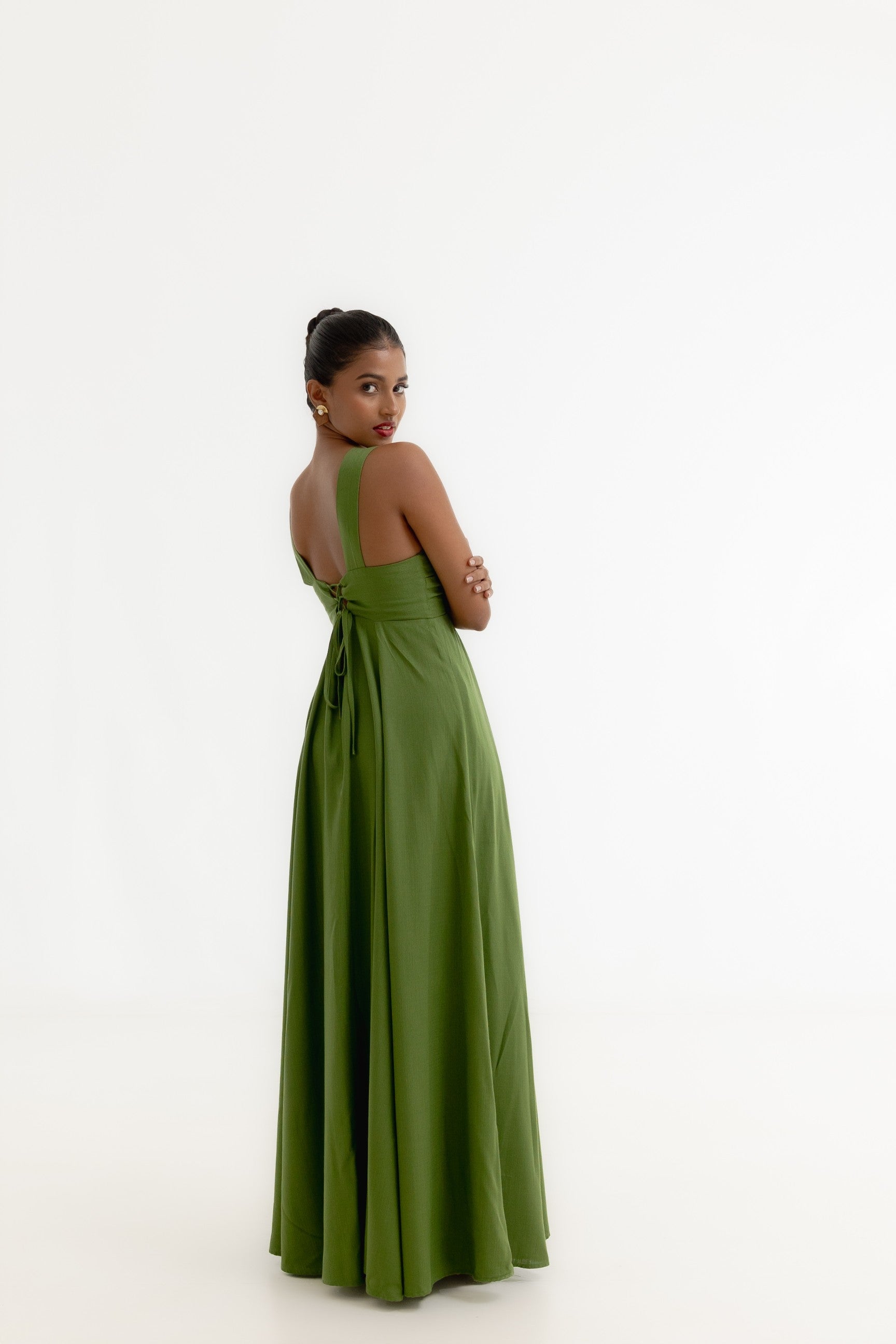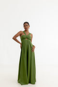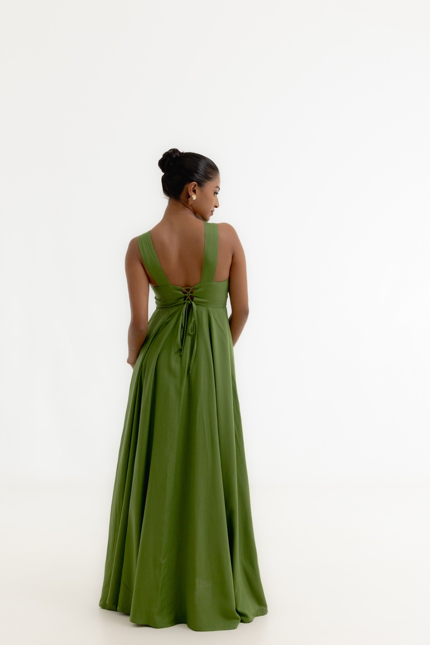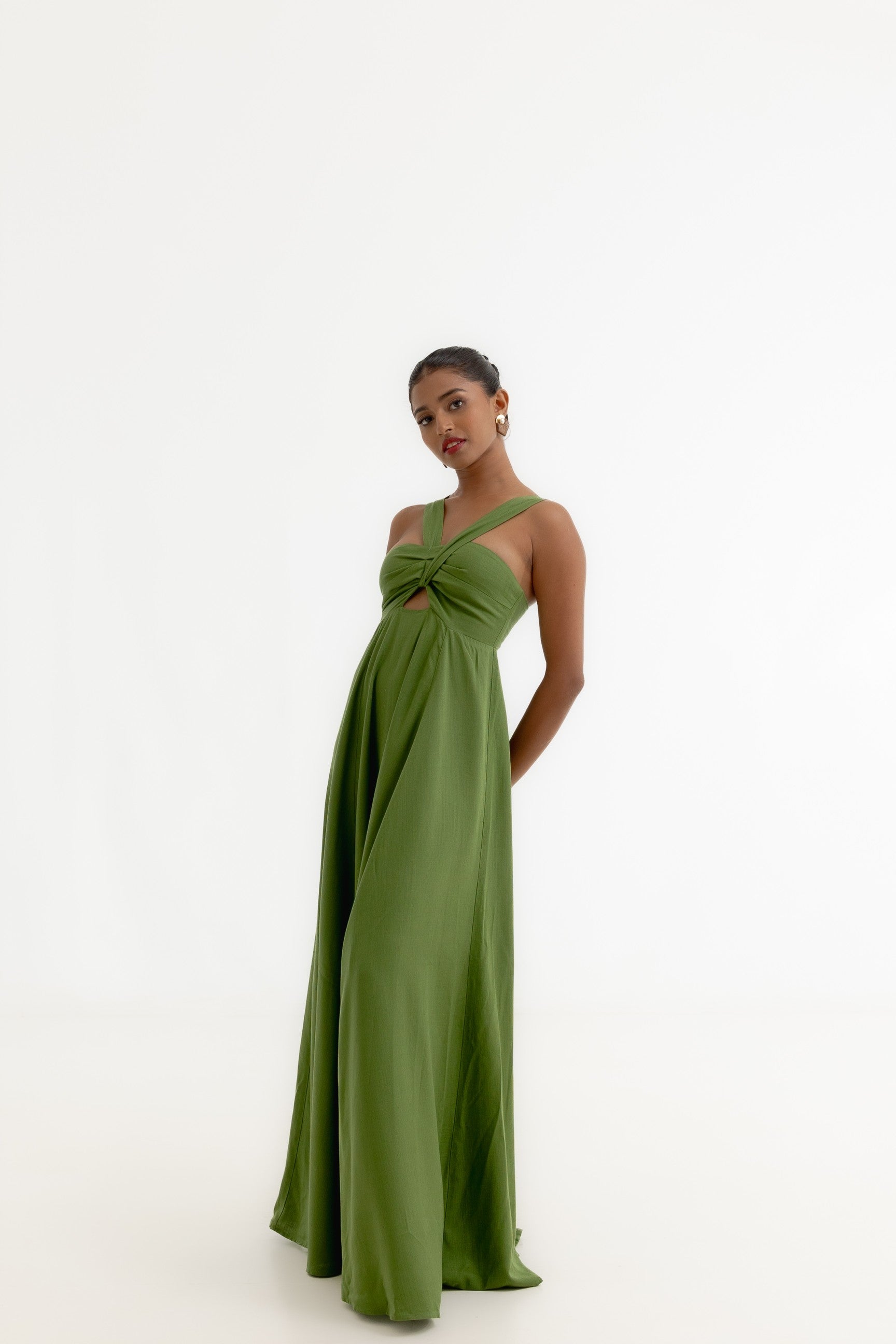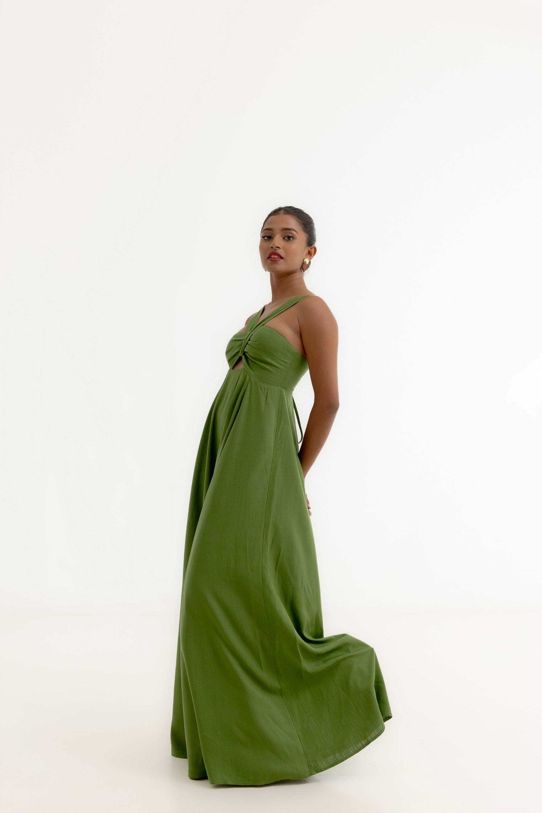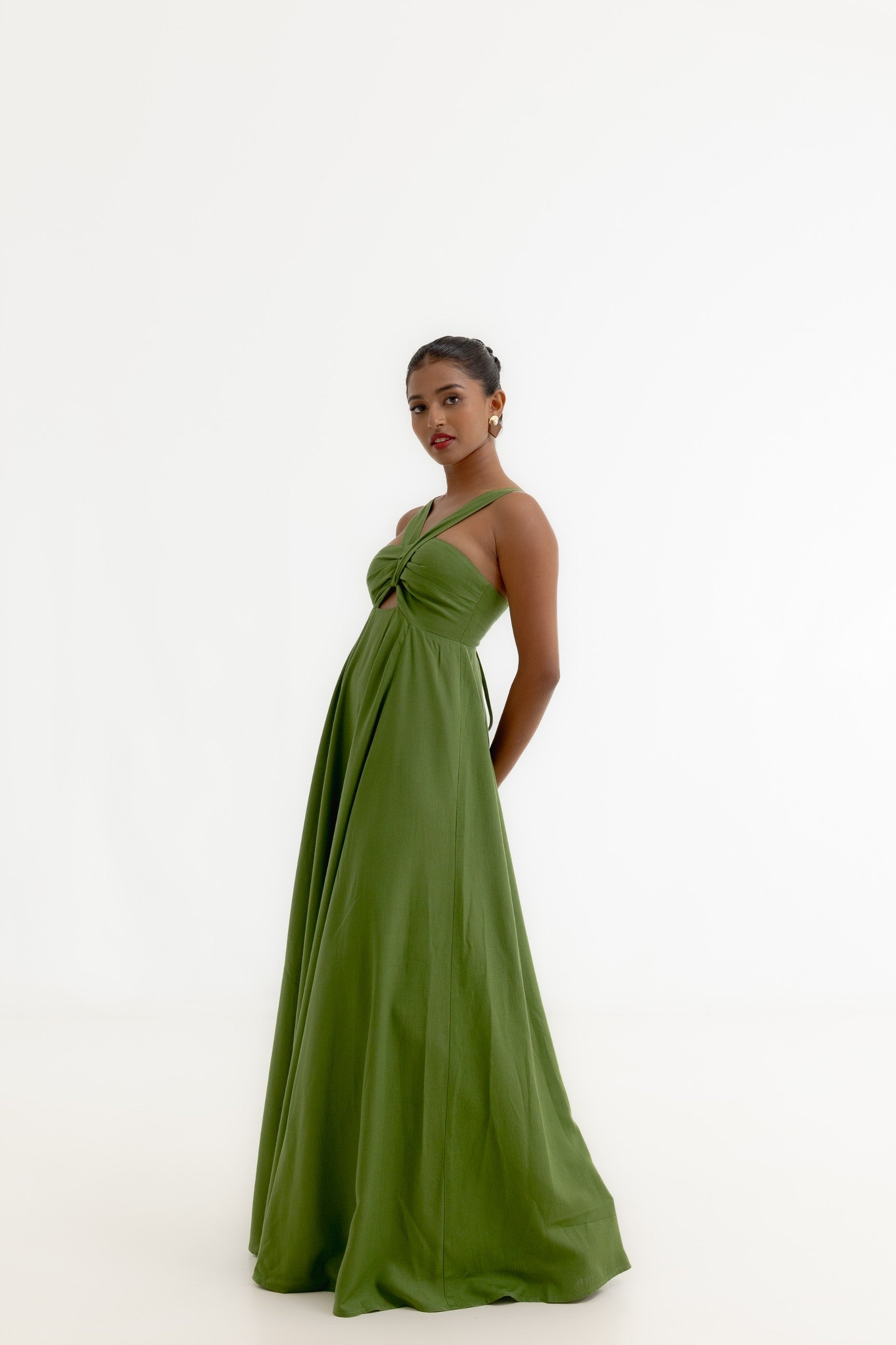 Halter neck with cut out detail at mid riff. For varied bust sizes there's an adjustable strap at the back. 360 degree voluminous skirt