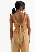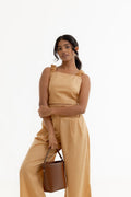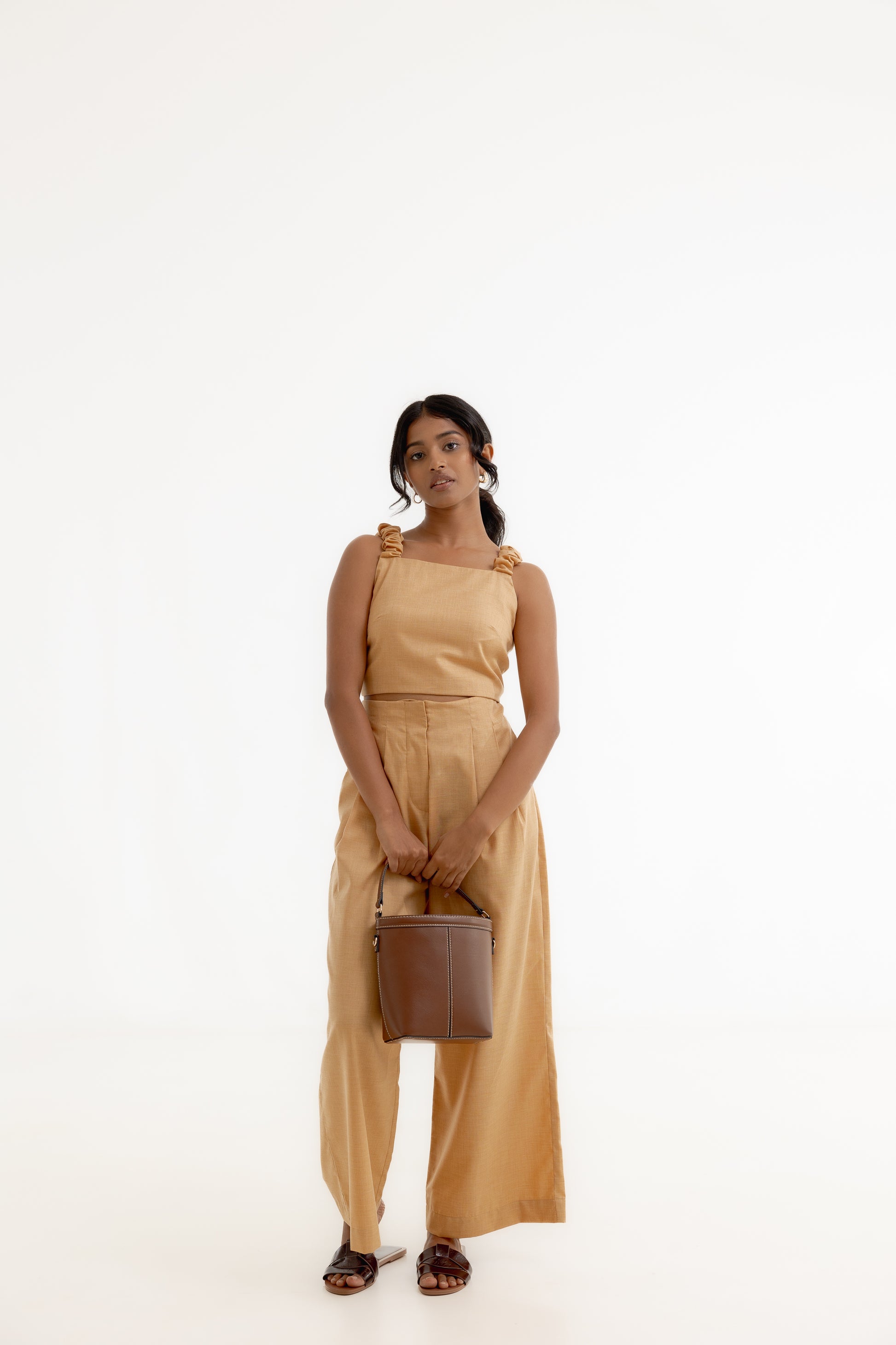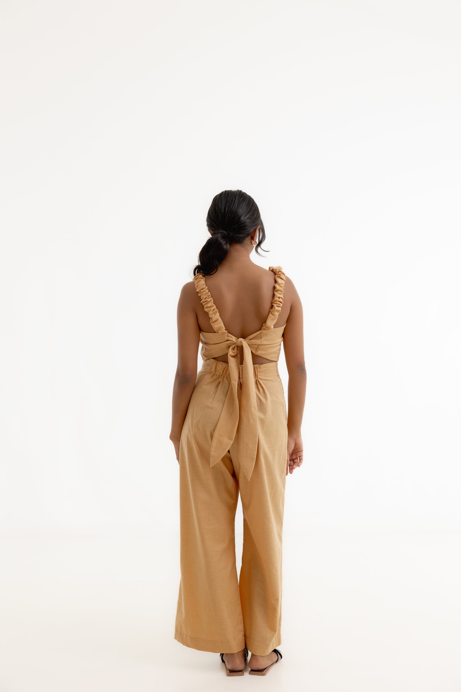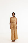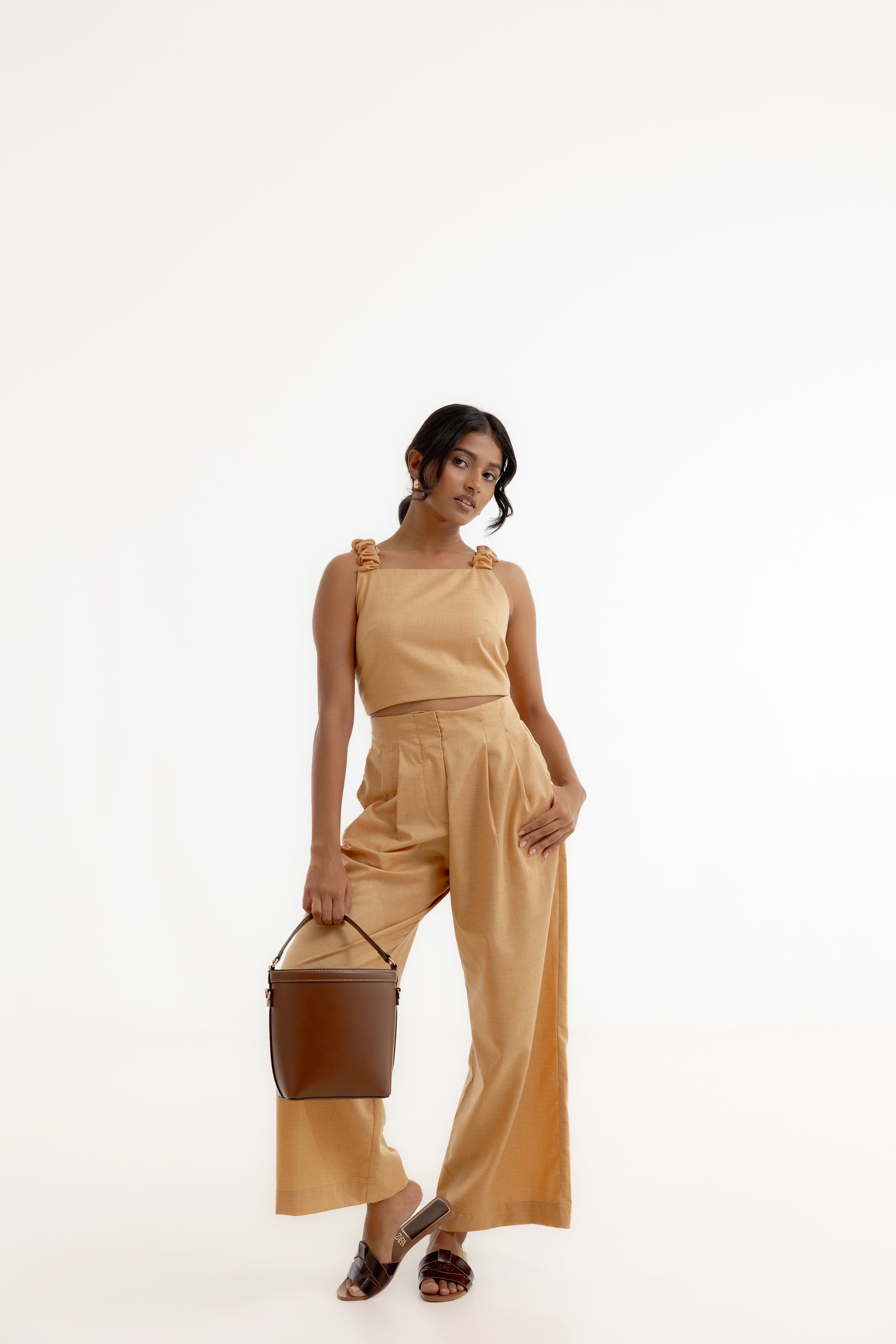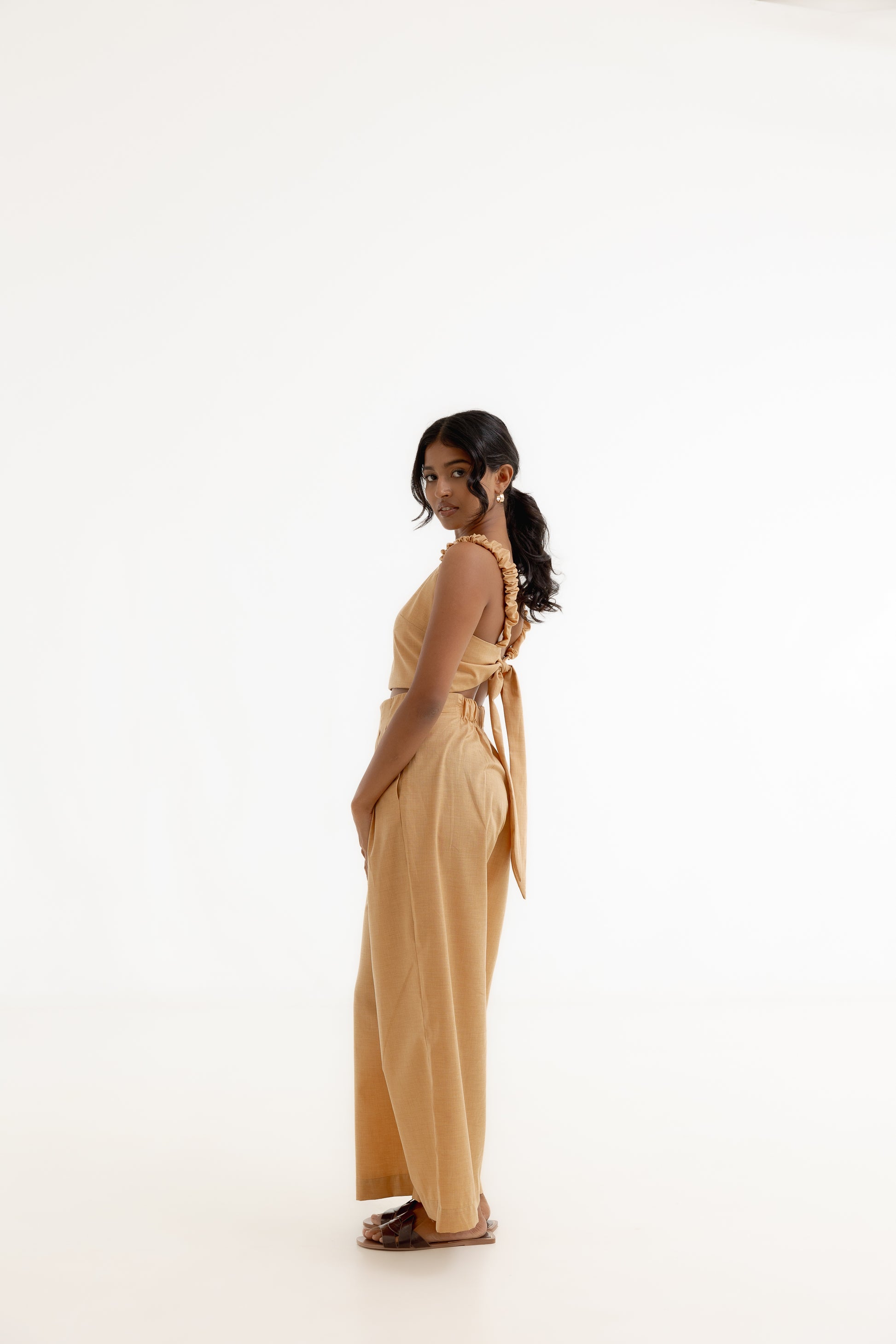 Wasit band with elastic at the back. Covered zip and wide leg.